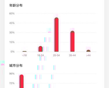 - Graphique d'Analyse d’audience : répartition en pourcentage par sexe, par tranche d’âge, par zone géographique, et centres d’intérêts (notes des autres utilisateurs, sciences sociales, tourisme, fun, nourriture, voiture)