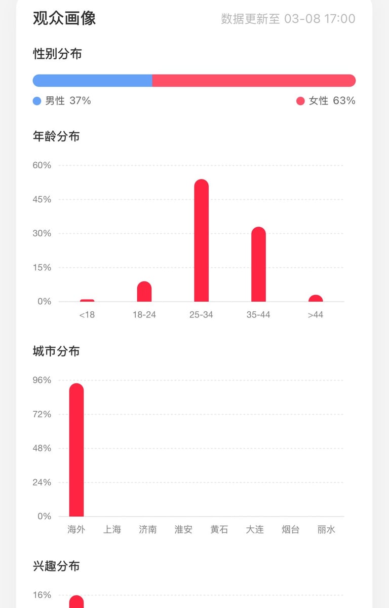 Le gain en nombre d’abonnés (mesure d'engagement). Une note de 5 signifie que la publication dépasse de 25% les publications du même type. Pour obtenir plus d'abonnés, des créateurs similaires mettent en place des avatars clairs et des profils personnels informatifs, choisissent des images d'arrière-plan attrayantes, utilisent des couvertures vidéo avec un style personnel et utilisent des notes épinglées pour afficher un contenu, ce qui contribue à améliorer le taux de fans de la page de profil.